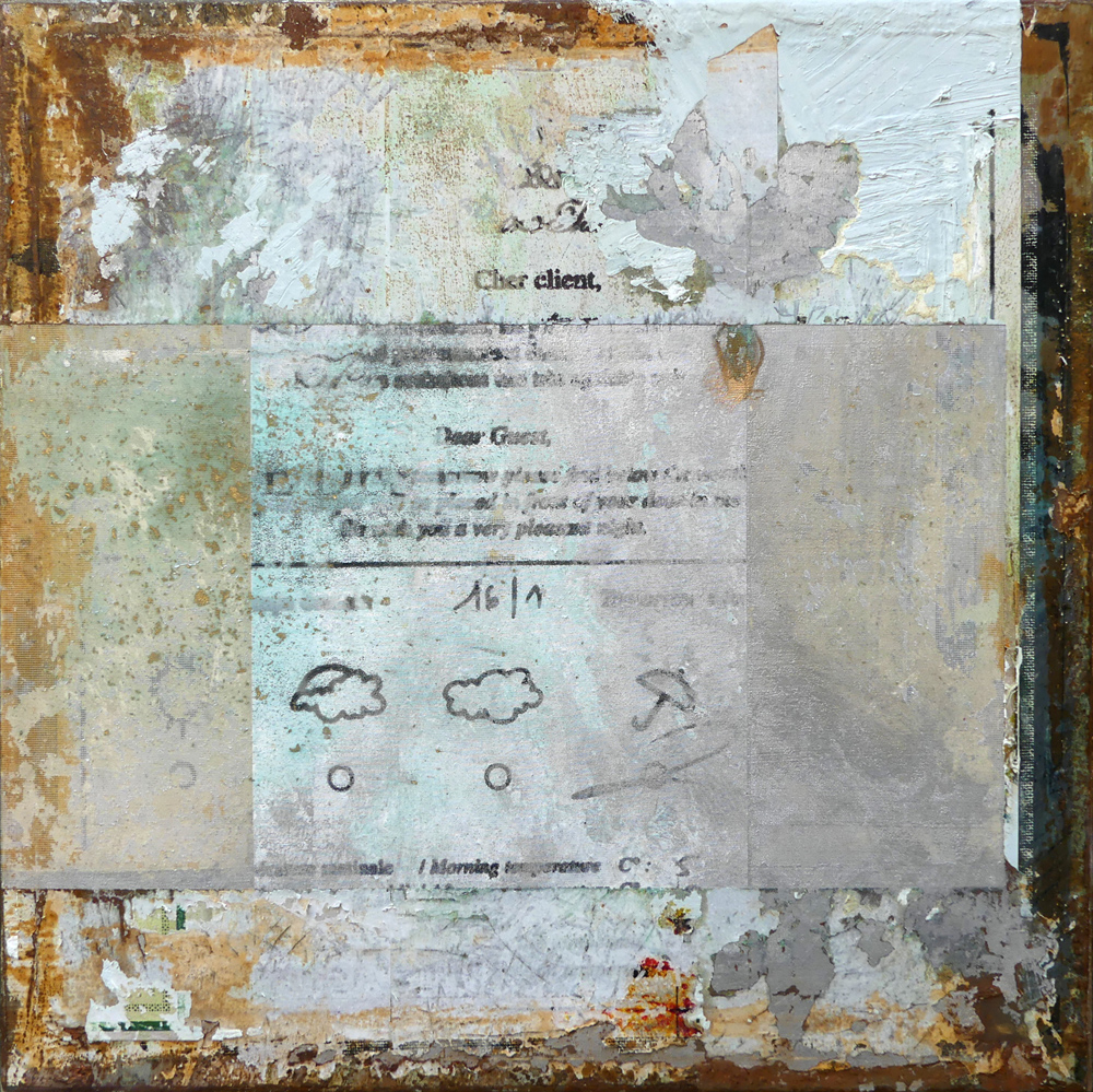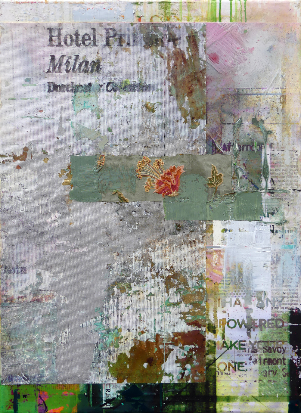 It is a constant juggling of different layers, speeds, and materials. There is no way to explain it all; it’s so much intuitive technicality—a constant interaction of paint, print, fabrics, mediums and effect. A juxtaposition of hiding and exposing, smudged with their own lost history.