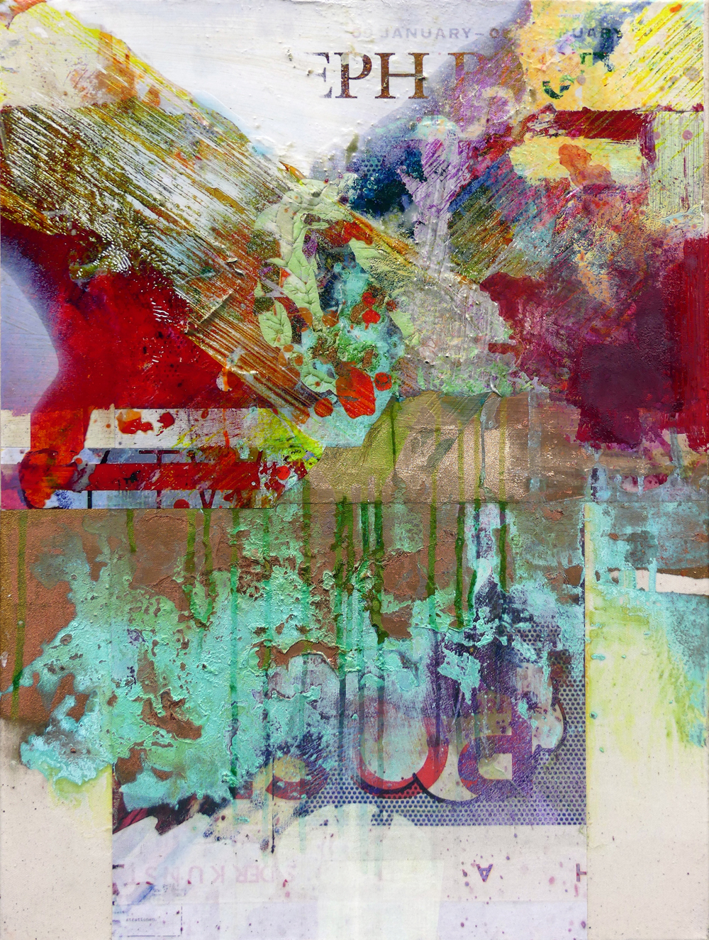 Perfectly poised between European and American traditions, his work combines complexity into a visual richness that is neither figurative nor abstract. The paintings unfold in an intricate, unpredictable interaction of layers and excess.